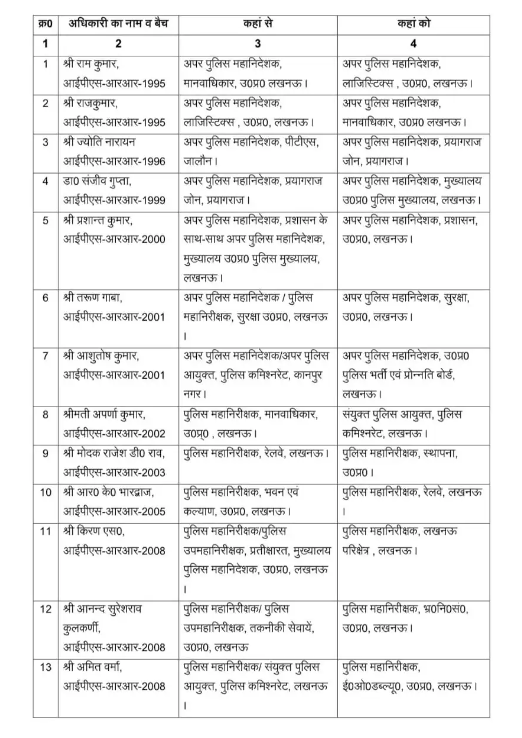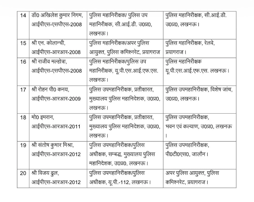उत्तर प्रदेश शासन ने मंगलवार को पुलिस विभाग में 20 वरिष्ठ आईपीएस अफसरों के तबादले कर दिए हैं. इस फेरबदल में ADG, IG और DIG स्तर के अधिकारियों को नई जिम्मेदारियां सौंपी गई हैं.